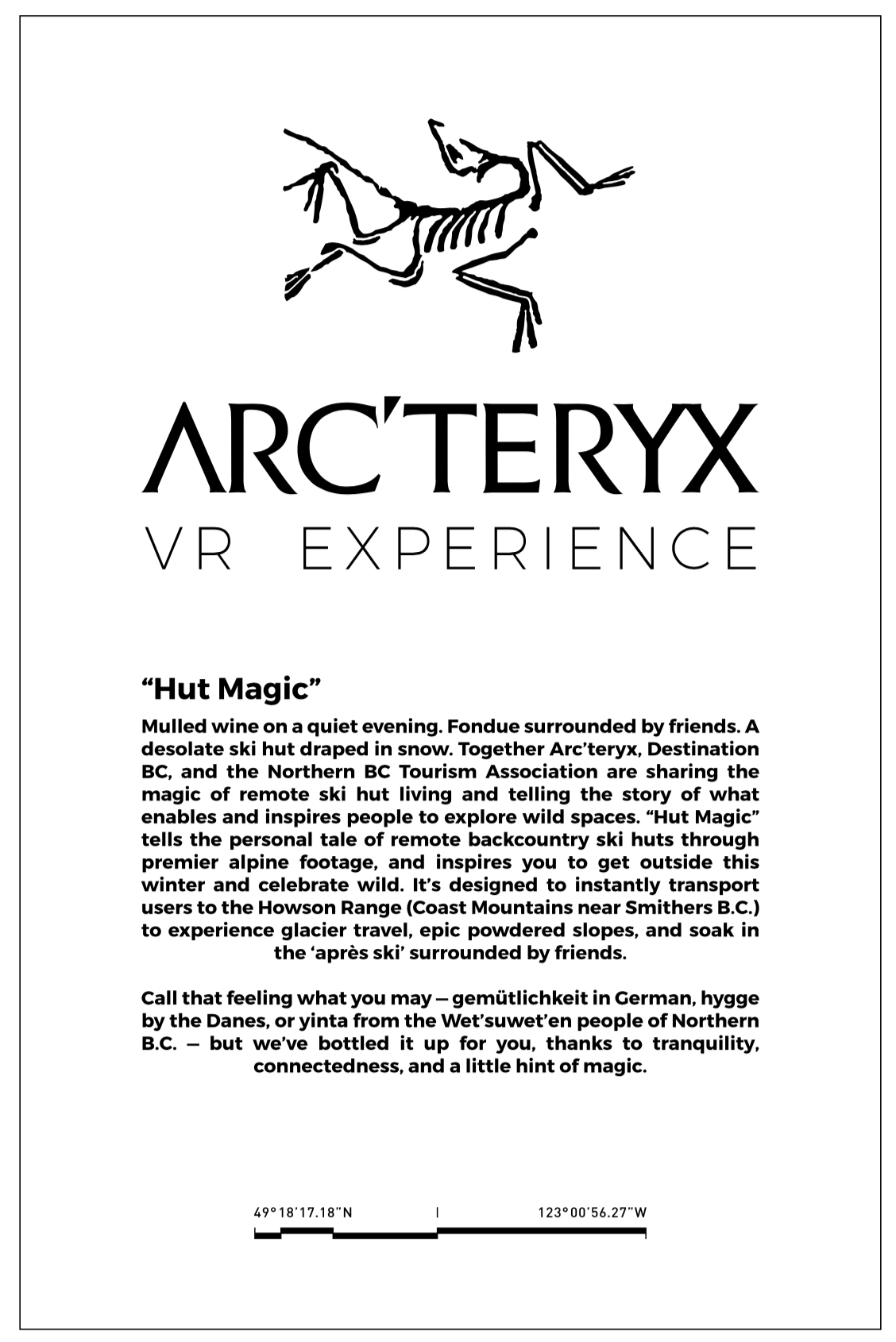 “Hut Magic” was a short VR piece for Arcteryx to give retail customers a backcountry hut experience. Arcteryx built out an in store activation with an Oculus headset installed in a makeshift cabin. The experience was built out in 17 brand stores across North America. Switchback also developed a custom, branded, white label application for playing the content.